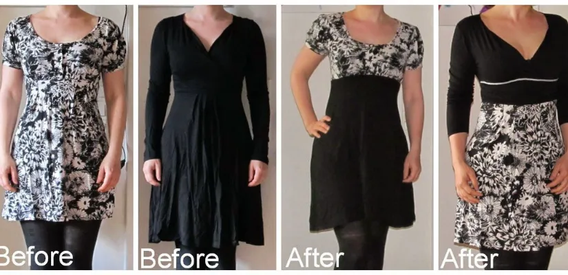 Combines two garments, for example, sewing the top of one dress to the skirt of the other, which is an alteration, especially if the skirt has a built-in waistline. Slicing apart a dress to produce a skirt or top is an easier variation of this style hack.