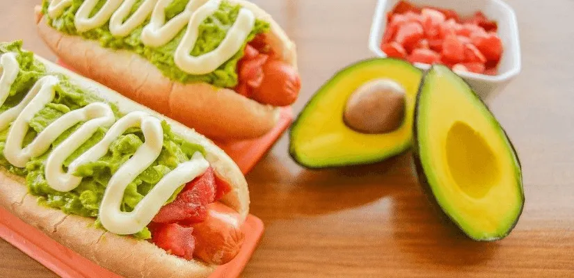 The completo is a hot dog version consumed in Chile. It typically has diced tomatoes, avocados, mayonnaise, sauerkraut, salsa Americana, aj pepper, and green sauce. It can be twice as big as a typical American hot dog.
